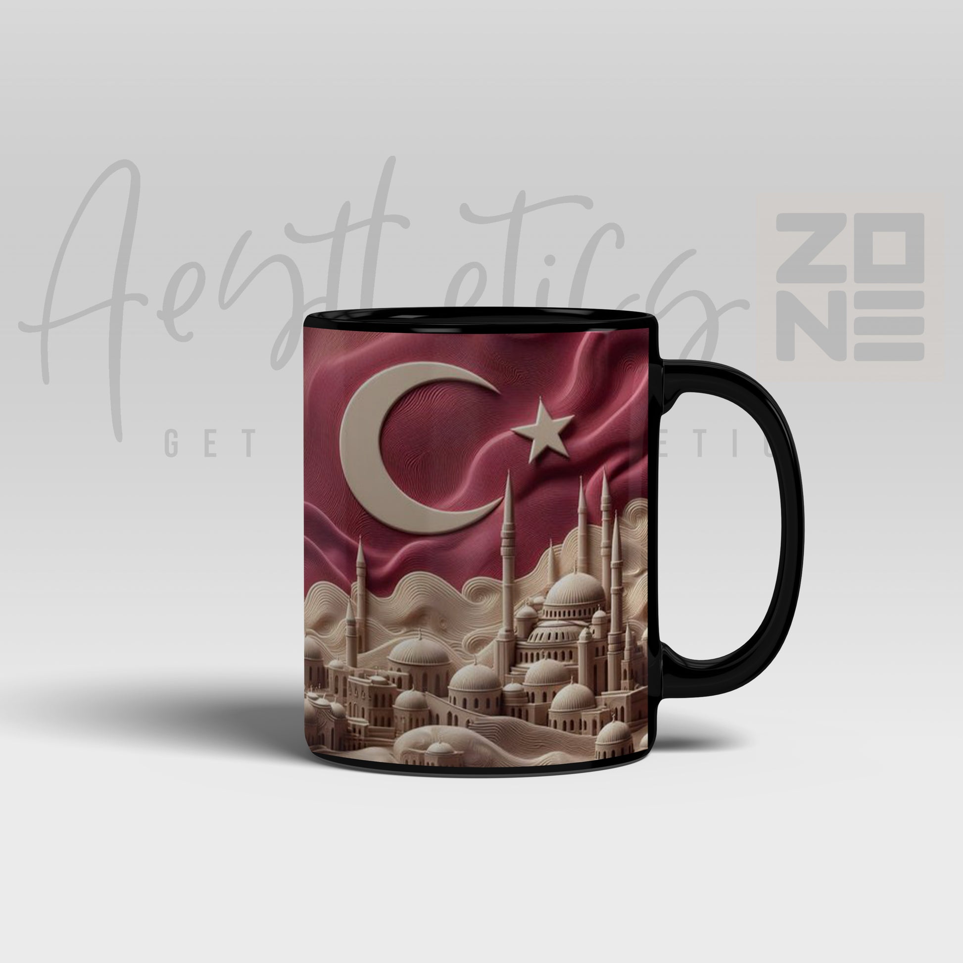 A stunning black glossy mug featuring a 3D crescent moon with mosque art design. The rich dark finish combined with detailed Islamic elements creates a bold and spiritual aesthetic—perfect for Ramadan, special gifting, or elegant everyday use.