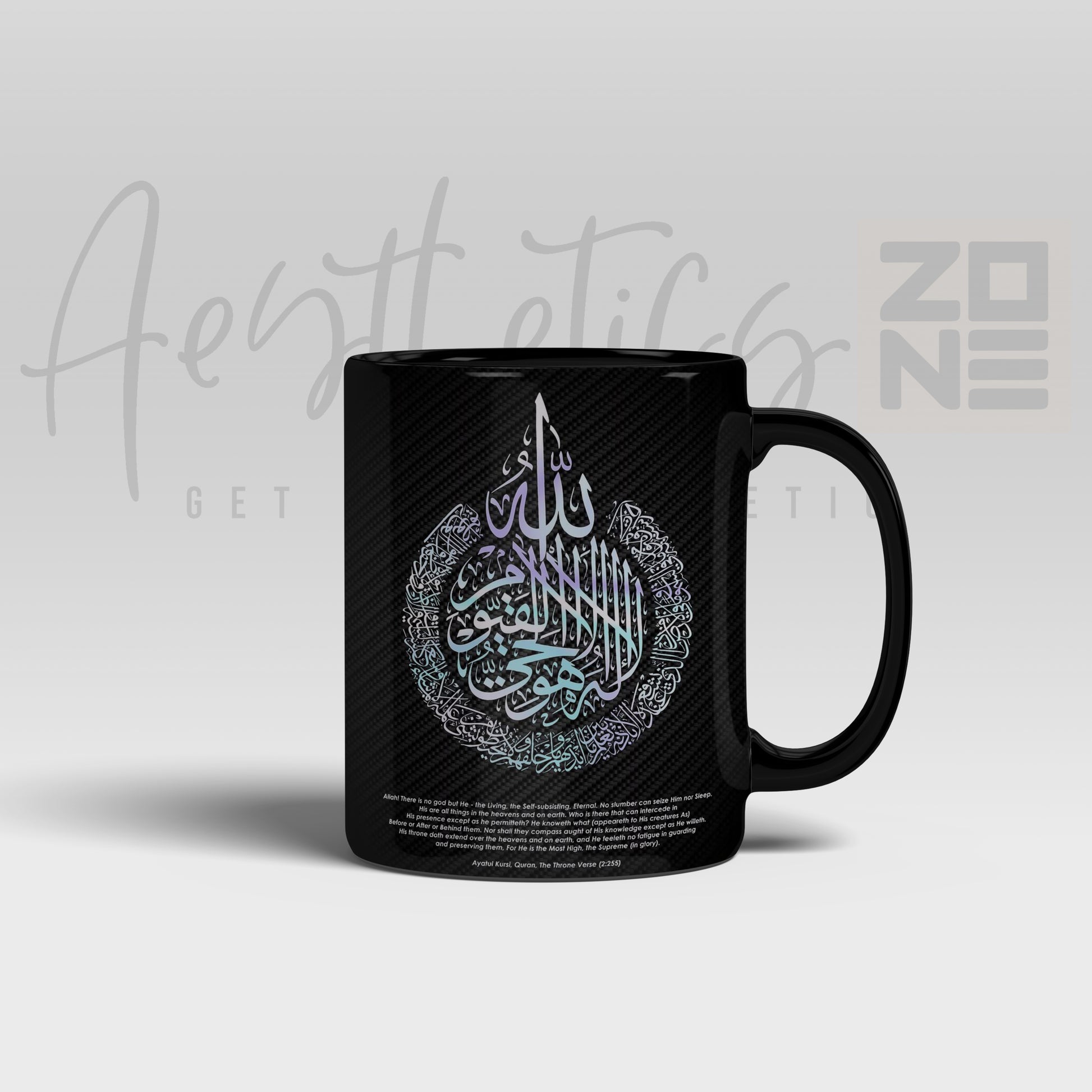 A premium black mug featuring white, reflective Ayatul Kursi calligraphy art. The high-contrast design creates a powerful spiritual presence, symbolizing protection, faith, and divine strength—perfect for Ramadan, daily remembrance, or meaningful Islamic gifting.
