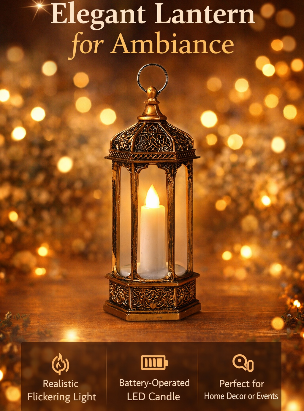 Bring a warm, festive glow to your home this Ramadan and Eid with this classic golden LED lantern. Beautifully detailed with Islamic motifs, it’s perfect for table décor, shelves, or gift sets.